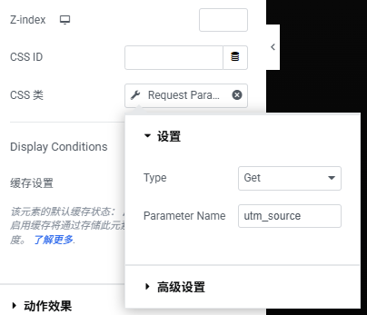 首先,在需要根据参数显示的组件中找到 css 类,选择动态标签(Request Parameter),设置 Type 为 Get,Parameter Name 设置为 utm_source(这个根据 url ? 后的设置参数)